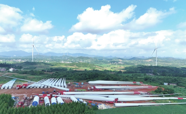 8月2日,江永县松柏瑶族乡风电设备转运场,工人在装运风力发电机叶片。近年来,该县积极发展风电、光伏等绿色能源产业,推动县域经济高质量发展。