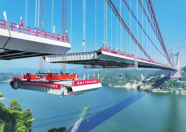 大桥全长1707米,主桥为800米单跨悬索桥,其合龙比预期提前2个月,为2026年张官高速通车按下“快进键”。届时,沅陵官庄到张家界市的车程将由原来的4小时缩短至1小时。