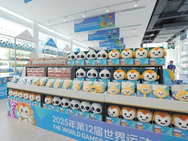 图为当日在成都世运会运动员村A区拍摄的官方特许商品零售店内的纪念品。新华社 发