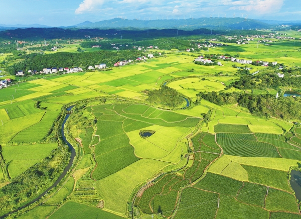 8月5日,衡东县石滩乡,稻田与菜畦相互交织,蜿蜒的小溪如玉带般穿行其间,与民居、青山共同构成层次丰富的田园画卷。