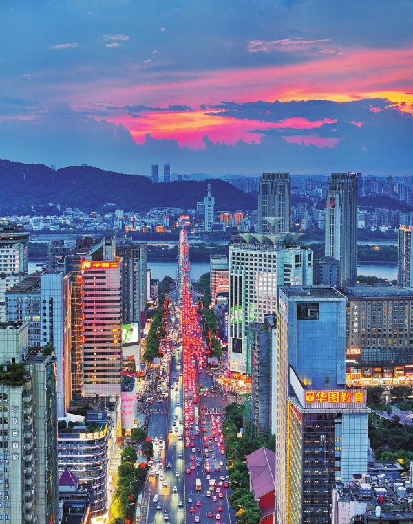 8月5日傍晚,长沙主城区天空出现瑰丽晚霞,与璀璨霓虹交相辉映,构成一幅动人的城市美景。