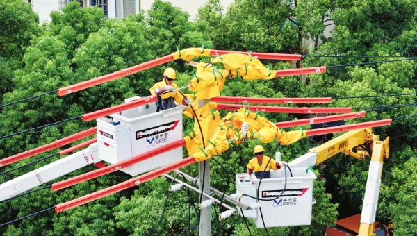 8月8日,国网长沙供电公司带电作业班顶着烈日,在芙蓉区恒达路10千伏教师村线路开展带负荷直线杆改耐张杆并加装柱上开关作业,保障沿线约2800户居民高温期间可靠用电。7月以来,该公司已累计开展带电作业消缺及抢修1283次,出动特种车辆800余车次、人员3000人次,实现供电“零影响”。