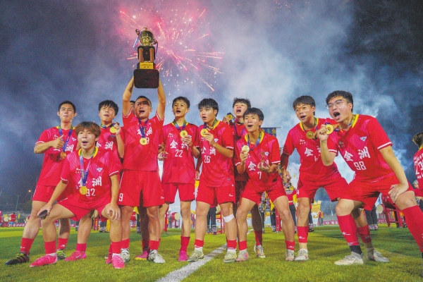 7月30日晚,保靖县体育中心,宁乡金洲代表队“举杯”庆祝。当天,“茶超视界”村超全国赛湖南赛区选拔赛在保靖县收官,冠军球队将征战全国村超赛场。 |
