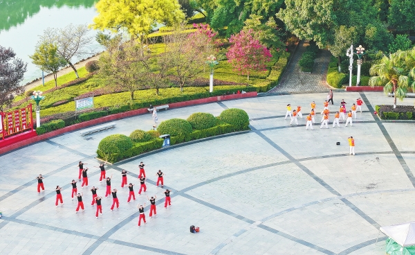 8月10日,市民在新田县双碧广场锻炼。近年来,该县持续改善生态环境,实施全民健身惠民工程,大力推进“家门口”的公园、广场等休闲绿地建设,不断完善健身场地设施布局,提升配套服务水平,营造浓厚的全民健身氛围。
