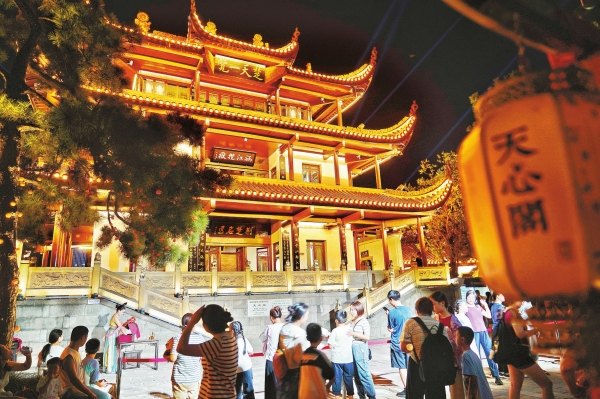 8月10日晚,游客在长沙天心阁景区参观游览。夜幕下,素有“潇湘古阁,秦汉名城”之美誉的天心阁,在光影的衬托下美轮美奂。游客来此,赏文艺表演、观水幕投影、参与有奖问答,感受长沙的文化魅力。