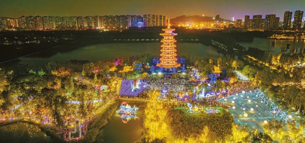 8月9日晚,游客在长沙洋湖国家湿地公园观赏花灯。本次灯展从7月3日持续至8月31日,设置了20多个夜游打卡点,游客在光影世界中穿梭,感受自然与科技、现实与梦幻的奇妙融合。