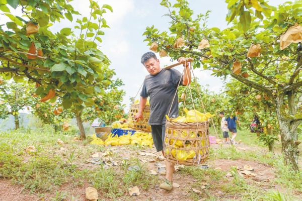 8月14日,吉首市双塘街道富强村,果农在梨园搬运金秋梨。眼下正值金秋梨、黄花梨丰收季,当地村民加紧采收供应市场。近年来,该村因地制宜发展金秋梨、黄桃、西瓜等特色产业,有效带动村民增收致富。