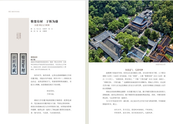 炎炎夏日,由湖南日报社编著、湖南人民出版社出版的《楹联里的湖南》,为读者奉上了一份融文学、文化、文旅于一体的精神大餐。从对岳麓书院大门名联“惟楚有材,于斯为盛”的解读开始,本书用一副副或长或短的楹联带领读者畅游三湘四水。然后,又从省内走向省外,从东南走到西北。百篇解联文章,百篇记者手记,数百张图片,将百余副楹联的实物形态、意义内涵及背后的故事娓娓道来,贯穿其中的是湖南人的精神、湖南人的生活。