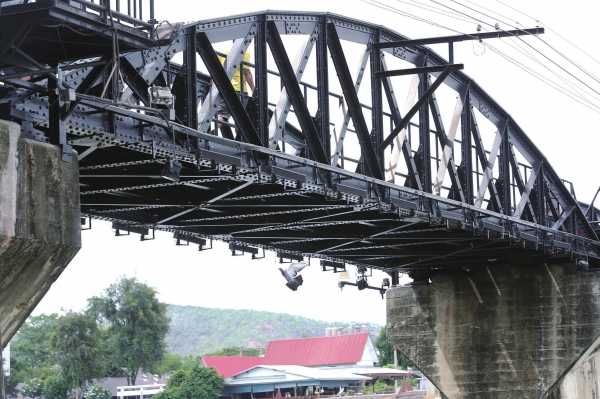 第二次世界大战期间,日本侵略者强征6万多名盟军战俘和30多万名东南亚劳工在泰国北碧府修筑长约415公里的泰缅铁路。在日军的威逼下,加之物资匮乏和条件严酷,十万余人在修建过程中丧生,这条铁路因此得名“死亡铁路”。桂河大桥是“死亡铁路”最著名的一段,泰国在二战后将其开发为纪念性景点,至今仍在为各国游客展示日本侵略者的累累罪行。这是8月13日拍摄的桂河大桥。