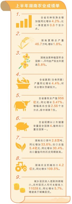 从洞庭湖畔的稻浪翻涌到湘南农村的特色种养,从岳麓山实验室的种质创新到生产流水线上的精深加工,湖南上半年农业经济答卷,结满了硕果。这份农业大省的责任担当,是对“确保谷物基本自给、口粮绝对安全”国家战略的坚定践行,也是千万湖湘儿女对美好生活的不懈追求。