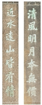 此联用白描手法,勾勒了一幅江南风景图。“清风明月”,是以沧浪亭等为代表的江南风光写照:婉约清淡、不染铅华。“近水远山”,描绘了沧浪亭的地理环境特征:周边环水,西南部当时可望见天平山和灵岩山。“本无价”和“皆有情”意为:美好的景色本是大自然的馈赠,却能映射人的情感。