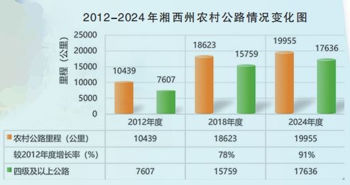 2024年底,全州农村公路总里程达19954公里(含年报外),创建“四好农村路”全国示范县市2个、城乡交通运输一体化示范县1个、湖南省“四好农村路”示范县2个,如今,全州实现县县都有一条美丽示范路、乡乡有一条美丽农村路。