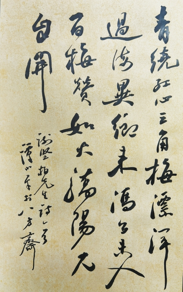 谭小平书谢坚柏《咏梅》诗。 释文:青绕红心三角梅,漂洋过海异乡来。冯公未入百梅赞,如火骄阳兀自开。