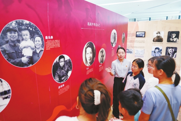 8月22日,市民在长沙图书馆参观《烽火芙蓉:湖湘女性抗战影像志》主题展览。该展览撷取百余幅珍贵影像,以女性视角切入抗战时期的历史叙事,为公众展现了湖湘女性抗战的全景图谱。