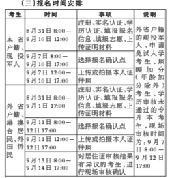 2.外省户籍的现役军人、申请免试入学考生、照顾加分(年龄加分除外)考生以及学历审核未通过的专升本考生,报名期间(9月7日8:00-9月12日17:00)须持本人有效身份证件和相关证明到本人选定的市州、县市区招生考试机构报名点进行现场审核。