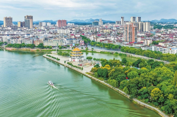 8月20日,游轮行驶在潇水河道县县城段。近年来,道县依托潇水河沿线的青山、绿水等生态资源,推出了游轮观光等项目,推动“生态+旅游”融合发展。