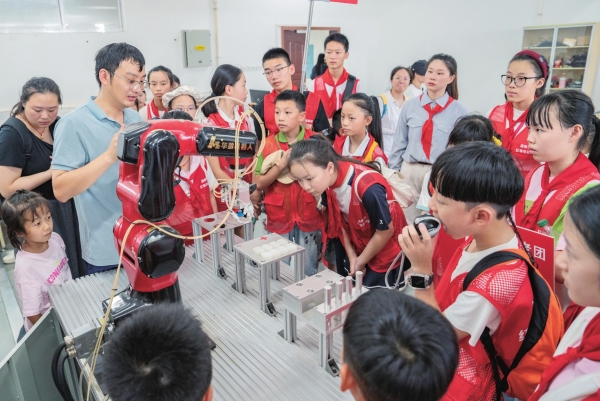 8月27日,少先队员在湘潭大学参观机器人实训操作。当天,由团省委、省教育厅、省少工委、湖南日报社联合组建的湖南省“红领巾记者团”走进湘潭大学,少先队员们参观校史展览馆、教学基地等,在行走的思政课中受到教育,锤炼本领。