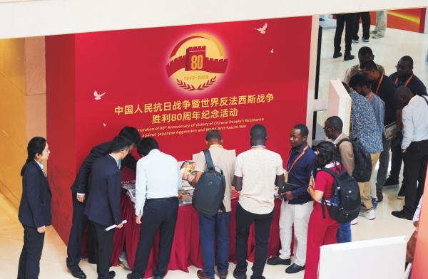 8月28日,北京梅地亚中心宾馆,媒体记者在现场领取资料。27日,中国人民抗日战争暨世界反法西斯战争胜利80周年纪念活动新闻中心开始对外接待服务。该中心为前来采访纪念活动的中外记者办理采访证件,安排参加纪念活动相关采访,提供传输通信手段、资料服务以及有关新闻采访方面的咨询。
