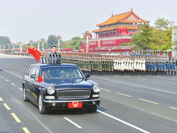 雄壮的军乐声中,习近平乘车沿着宽阔的长安街,依次检阅13个徒步方队、1个战旗方队、22个装备方队。受阅部队军容严整、意气风发,铁甲战车整齐列阵、威风凛凛。这是人民军队奋进建军百年的崭新亮相,这是中华民族捍卫世界和平的坚定宣示。