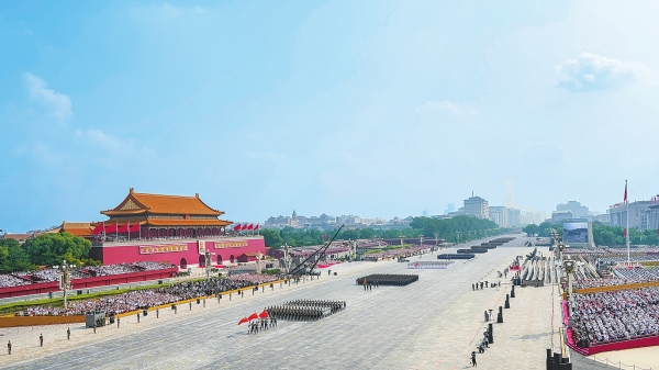首都北京,花团锦簇,旌旗飘扬。天安门城楼庄严雄伟,天安门广场气象恢宏。人民英雄纪念碑前,“钢铁长城”主题景观巍然矗立,14座烽燧托举起“1945”“2025”字样,14只“和平鸽”振翅飞翔。从空中俯瞰,广场中“众”字造型观礼台蔚为壮观,象征着在中国共产党领导下中国人民万众一心、众志成城,向着中华民族伟大复兴昂扬奋进。
