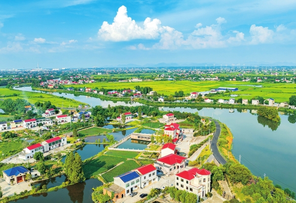 9月5日,蓝天白云下的长沙市望城区靖港镇,清澈纯净的河流、阡陌纵横的田野与错落有致的民居相映成趣,勾勒出一幅和谐共生的田园画卷。