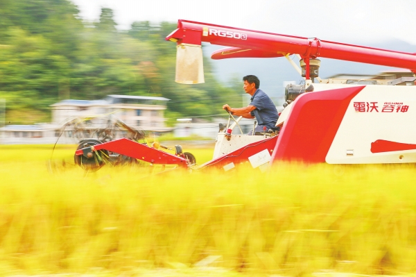 9月7日,龙山县召市镇三堡村,农民驾驶农机在收割中稻。当天是白露节气,当地农民抢抓农时作业,田间地头一片农忙景象。
