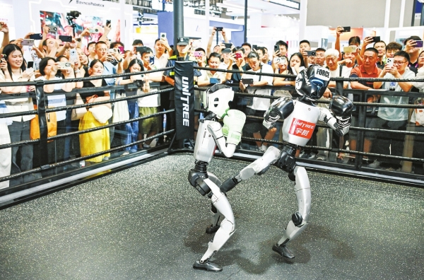 9月5日至8日,2025世界智能产业博览会在重庆举行。众多人形机器人在智博会上亮相,为观众带来不少乐趣。图为9月5日,观众在2025世界智能产业博览会上观看人形机器人拳击比赛。