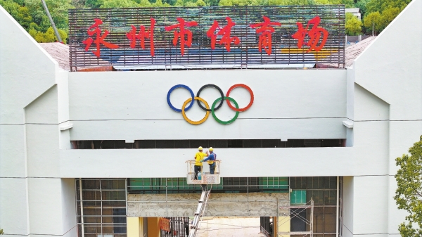 9月9日,永州市体育场,施工人员正紧锣密鼓推进场馆提质改造工程,全力保障湘超联赛的顺利举办。