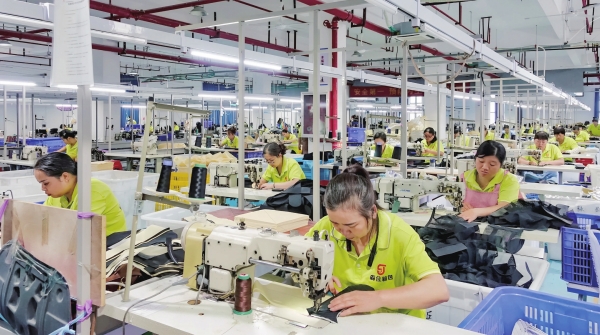 9月10日,麻阳产业开发区,森佳箱包公司工人在加紧生产。该公司生产的背包、旅行包等产品主要出口坦桑尼亚、津巴布韦、俄罗斯等地。
