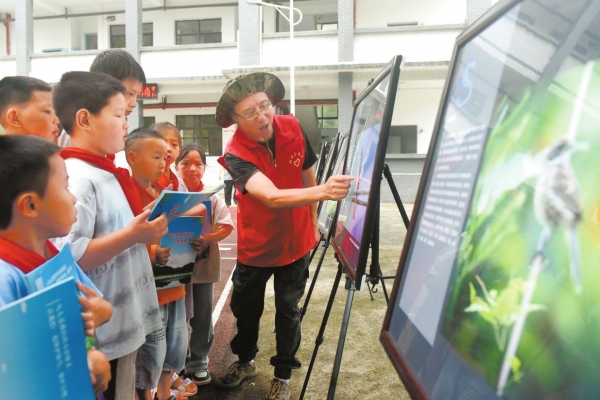 9月11日,蓝山县浆洞瑶族乡浆洞中心小学,科普志愿者在向学生讲述护鸟知识。近日,该县运用科普大篷车开展科普宣传进校园活动,增强学生爱鸟护鸟意识。