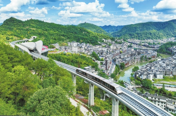 绿水青山间、蜿蜒沱江畔,从高空俯瞰,全长9.121公里的凤凰磁浮观光快线犹如一条长龙,“飞行”在古城之中。这是全球首条山地磁浮、全国首条旅游观光磁浮线路,无缝连接凤凰古城高铁站和凤凰古城核心景区。