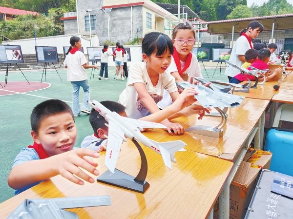 9月19日,蓝山县荆竹瑶族乡中心小学,学生在观看航模。近期,该县开展科普宣传进基层活动,通过科普宣讲和操作体验,把优质科普资源带到偏远山区学校,激发青少年的好奇心、想象力。