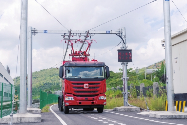 在中车株机“智道”电气化公路试验区,一辆经过改装的红色重卡升起受电弓,接触上方电网后向前方驶去,又快又稳。
