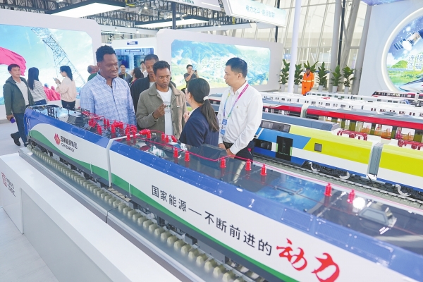 9月24日,北斗场景示范展现场,嘉宾在了解国能号12轴电力机车。