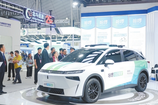 9月24日,北斗场景示范展现场,嘉宾在参观哈啰自动汽车。