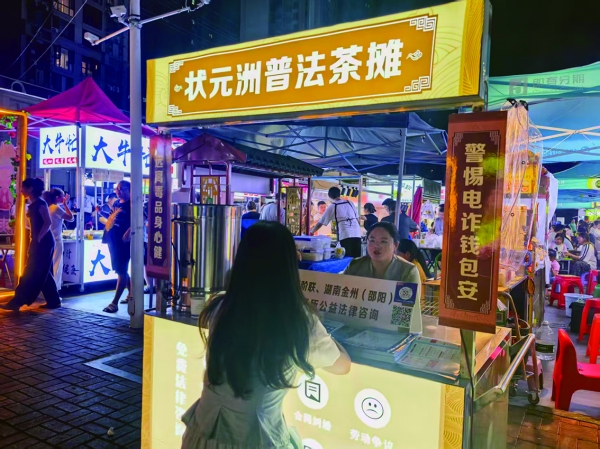 邵阳市北塔区“宝庆夜市”,霓虹闪烁,宵夜摊前人头涌动,食客不断。邵阳市司法局联合湖南金州(邵阳)律师事务所、状元洲街道设立的“状元洲普法茶摊”在这里摆了起来,律师们定期“练摊”,人流中时常有三五人前来咨询,领取宣传资料。这种“矛盾共防”的场景每天都在邵阳上演。