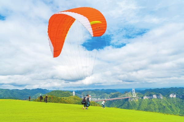 9月27日,吉首市矮寨风景名胜区滑翔营地,游客前来体验空中俯瞰矮寨大桥和苗岭大峡谷的独特视角。为迎接国庆、中秋假期,景区升级营地设施,通过直播引流等方式吸引游客,带动当地文旅消费热潮。