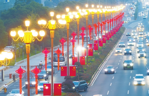 9月30日,长沙市岳麓大道,两旁路灯杆悬挂起了鲜艳的国旗,营造出浓厚的节日喜庆氛围。