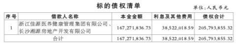 本次拟处置的资产为浙江佳源医养健康管理集团有限公司单户债权资产(以下简称“标的债权”)。截至2025年1月10日(处置基准日),标的债权总额合计20,579.38万元,其中本金余额16,727.18万元,利息及其他费用3,852.20万元。标的债权明细详见下表: