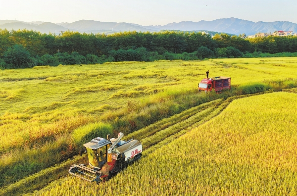 10月4日,嘉禾县晋屏镇甫口村,种植大户驾驶农机收割晚稻。当前正值秋收关键时节,当地农户抓住晴好天气开展收割作业,确保粮食颗粒归仓。
