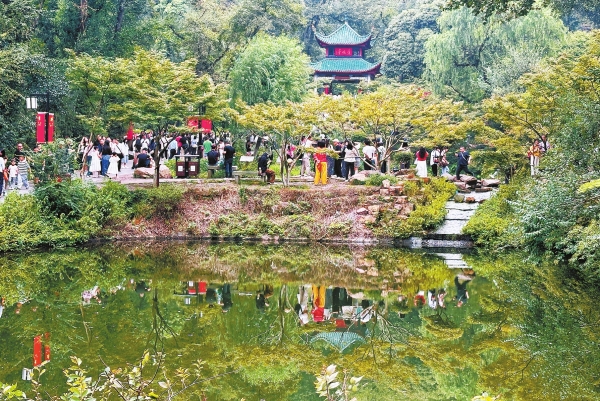 10月4日,长沙岳麓山景区,游客在爱晚亭前打卡。连日来,该景区迎来国庆客流高峰,日均接待游客近10万人次。