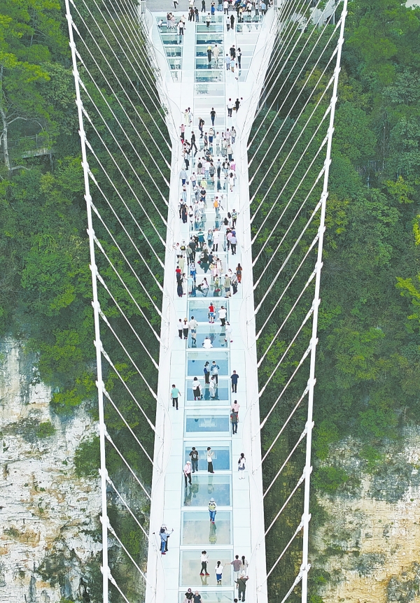10月5日,张家界大峡谷景区高空玻璃桥上游客如织。游客们在这里体验“云端漫步,如履薄冰”的惊险与刺激,尽享户外休闲乐趣。吴勇兵 摄(湖南图片库)