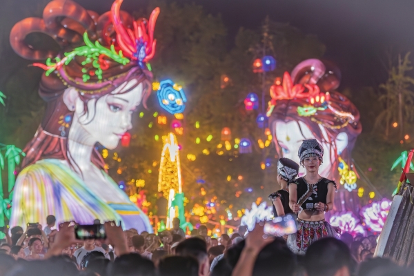 10月7日晚,游客在长沙洋湖国家湿地公园赏花灯、看演出。