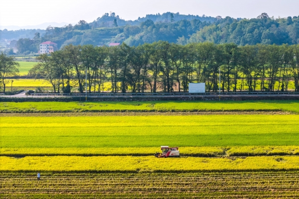 10月11日,双峰县井字镇生机村,农民驾驶收割机收获晚稻。金秋时节,该县涓水河畔万亩粮食生产示范区的晚稻迎来收获季,当地农民抢抓农时开展晚稻收割工作。