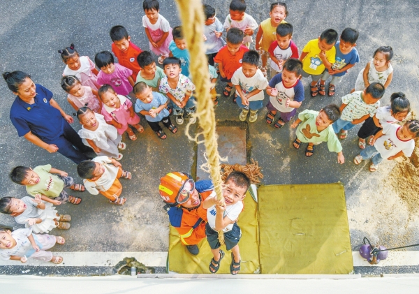 10月13日,道县消防救援大队,小朋友在消防救援人员的协助下体验绳索攀爬。当天是国际减灾日,道县消防救援大队邀请当地幼儿园小朋友走进消防营区,学习消防安全知识、体验使用消防水枪,向他们普及防灾减灾知识。