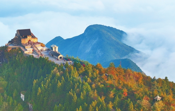 10月16日,衡阳市南岳衡山风景区层林渐染,山间云海翻腾,呈现出一派迷人的秋色,吸引了众多游客前来赏景游玩。