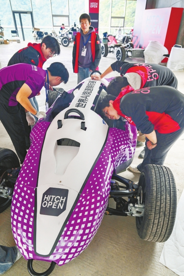 10月17日,清华大学极限竞速战队的参赛选手在赛前组装比赛用车。