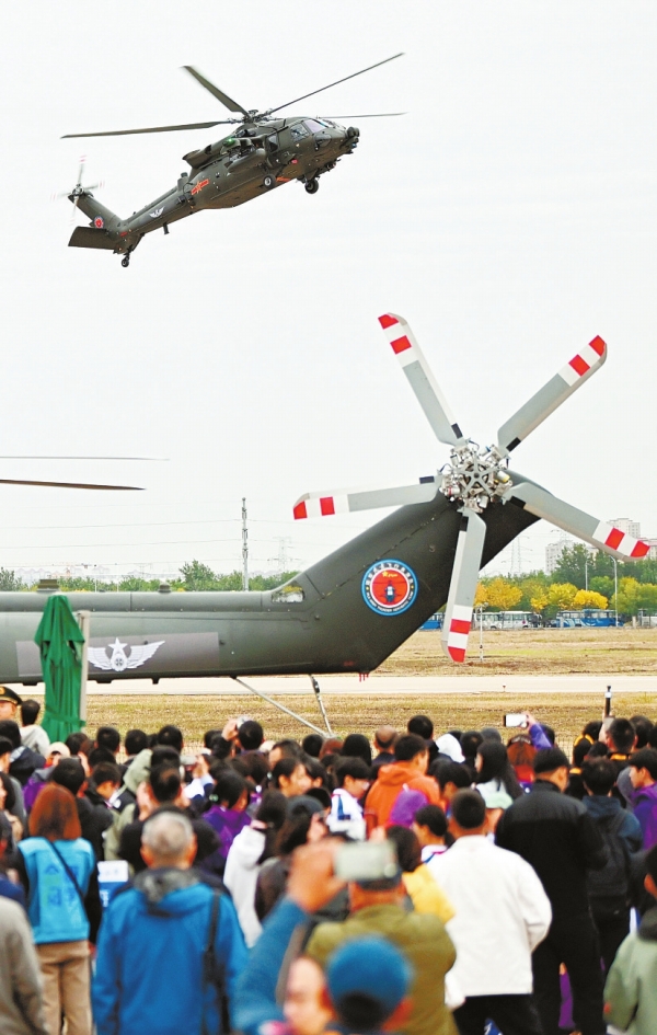 10月16日至19日举行的第七届中国天津国际直升机博览会上,首次在直博会亮相的直-20T直升机备受瞩目。图为17日,直-20T直升机在进行飞行表演。