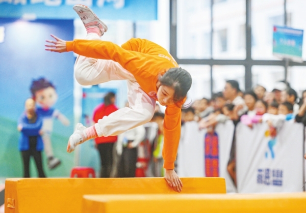 10月18日,小选手在比赛中翻越障碍。当天,2025年湖南省跑酷冠军赛在长沙市开福区新竹第二小学开赛。