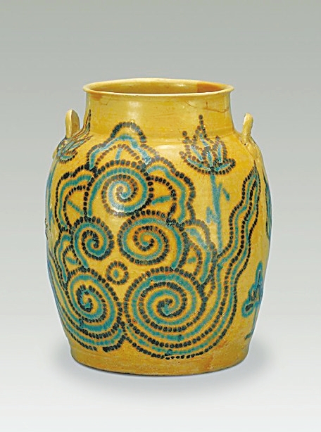 此后老师将撰写发掘区工作汇报的任务交给我,重新取出长沙窑瓷片后,我才开始认真审视它。师妹此前先找到了同类器的资料,即扬州博物馆藏(以下简称“扬博”)长沙窑青釉褐绿点彩云荷纹双耳罐。看着眼前这件仅有二十几平方厘米的瓷器残片,我实在难以将它和作为“镇馆之宝”的扬博同类器联系起来。